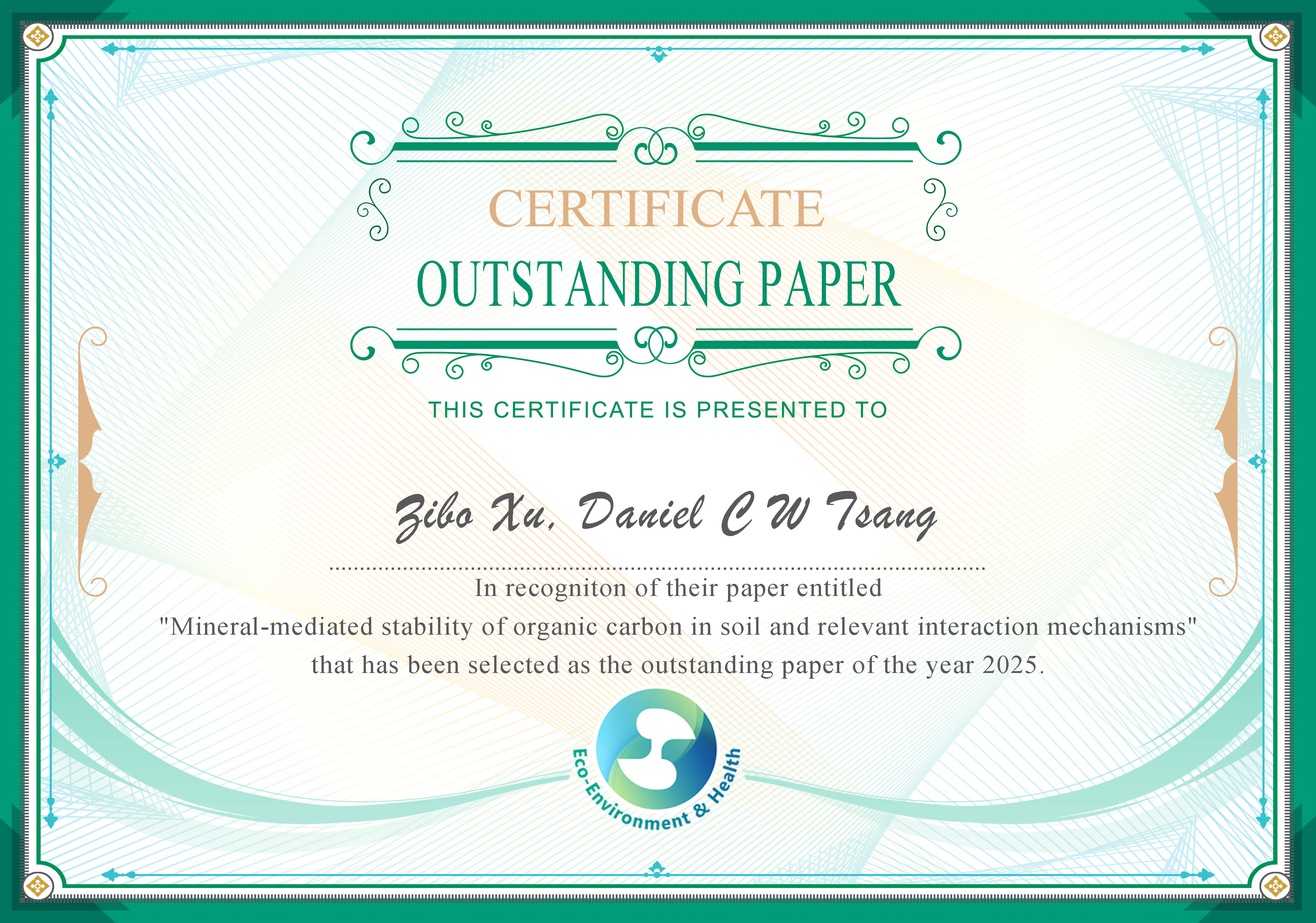A paper co-authored by Prof. Dan TSANG, Professor of the Department of Civil and Environmental Engineering (CIVL) and Director of the Research Center on Decarbonization Technology, and Dr. XU Zibo, Research Assistant Professor of the CIVL Department, was named an Outstanding Paper of the journal Eco-Environment & Health (EEH) in the year 2025. The paper is titled “Mineral-mediated stability of organic carbon in soil and relevant interaction mechanisms”, published in EEH in March 2024 (Volume 3, Issue 1). Only five papers were selected for the honor each year.